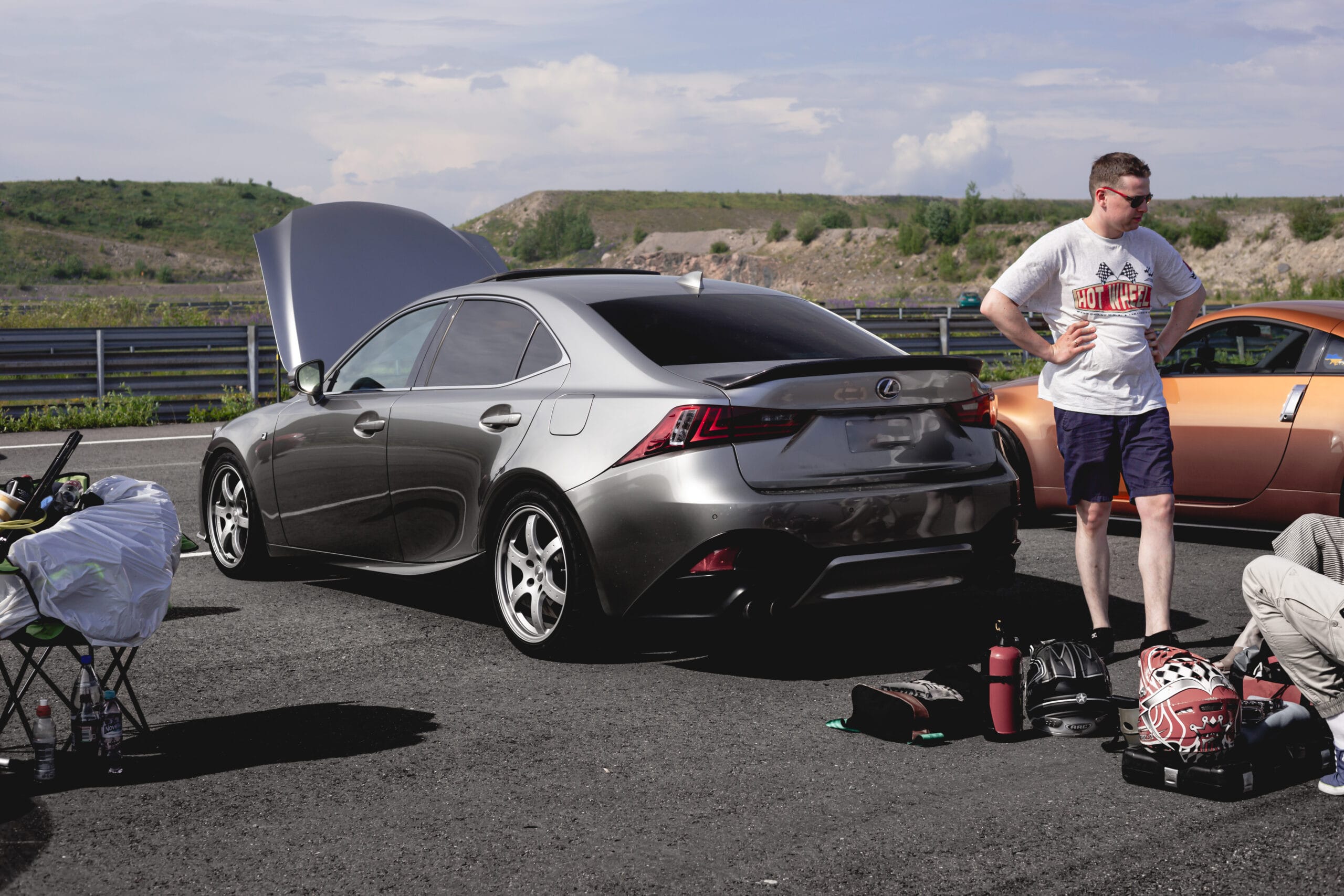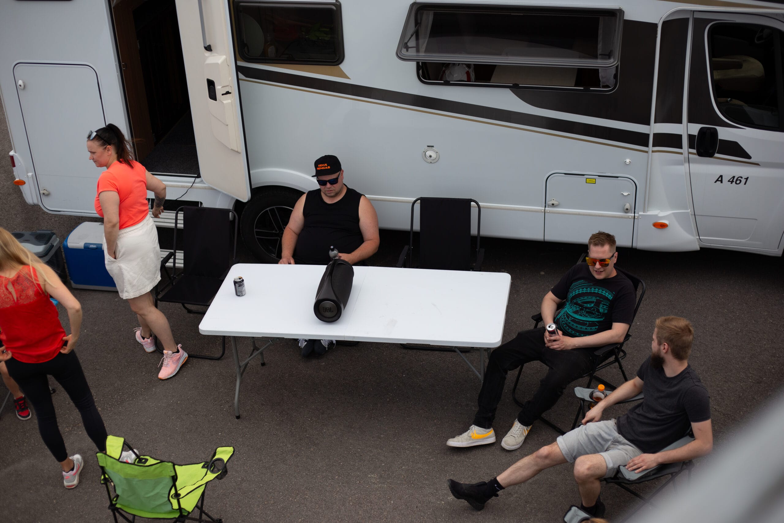 Ohjelman suhteen emme ole koskaan olleet kovia aikatauluttajia. Meillä on aina tiedossa vain päämäärä, mutta matka sinne on yleensä aika spontaani. Tällä kertaa kuitenkin päätimme järjestää myös oheisohjelmaa niille, jotka eivät ole niin kiinnostuneita rata-ajosta. Eli grilli oli kuumana! Timppa Kehärenkaalta tarjosi meille matkailuauton käyttöön, mikä oli ihan loistava veto. Keli oli +24, eikä varjopaikkoja juuri ollut, joten matkailuauto tarjosi oivat puitteet rentoutumiseen ajon välissä.